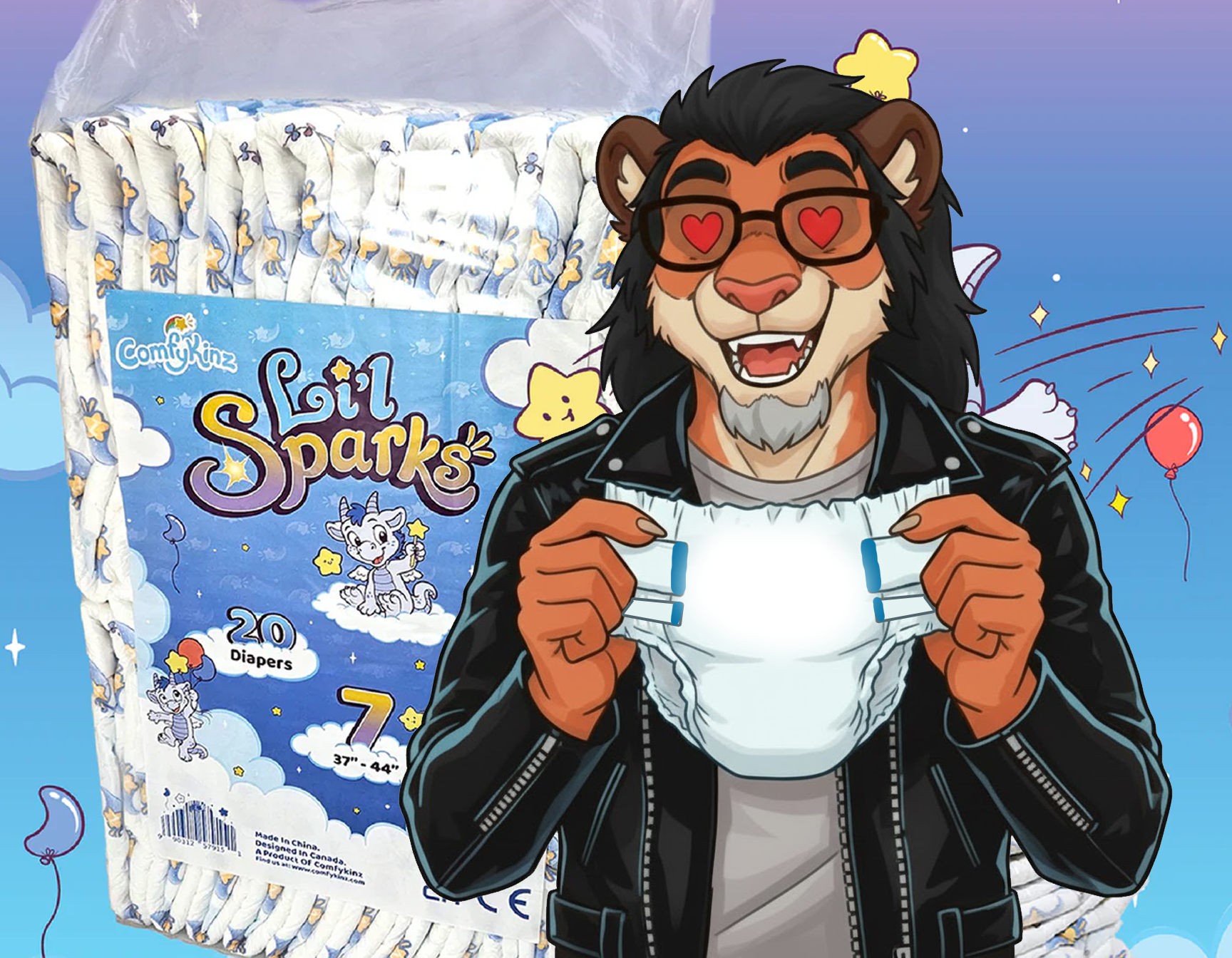 When two absolute icons of the babyfur scene team up, expectations are sky-high — and ComfyKinz delivered. The bag art alone is worth framing: Marci’s signature style brings us Sparks, an adorable little blue cloud dragon clutching a glowing wand, surrounded by pastel balloons and dreamy clouds on a soft lavender background. It’s giving 1980s–90s Pampers/Luvs nostalgia without copying anything directly. Subtle, cozy, and instantly comforting.